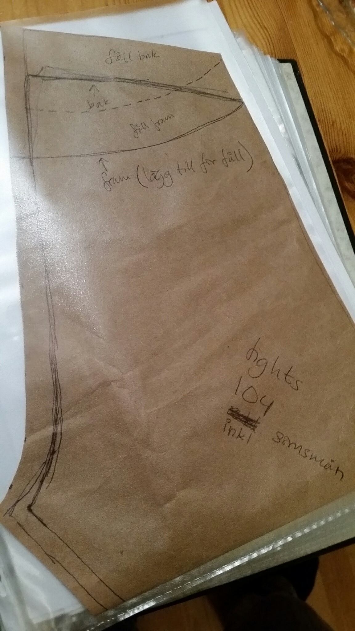 Det nedladdade mönstret skriver man ut på sin vanliga skrivare, tejpar ihop bladen och vips, mönster. Sedan kan man ju välja att klippa ut mönster i den storlek man vill ha eftersom man bara kan skriva ut ett nytt exemplar när man vill ha större storlek. Men jag valde att lägga smörgåspapper på och rita av. Barn är ju inte så stora, så smörgåspapper räcker till för mönsterpapper, då. 🙂