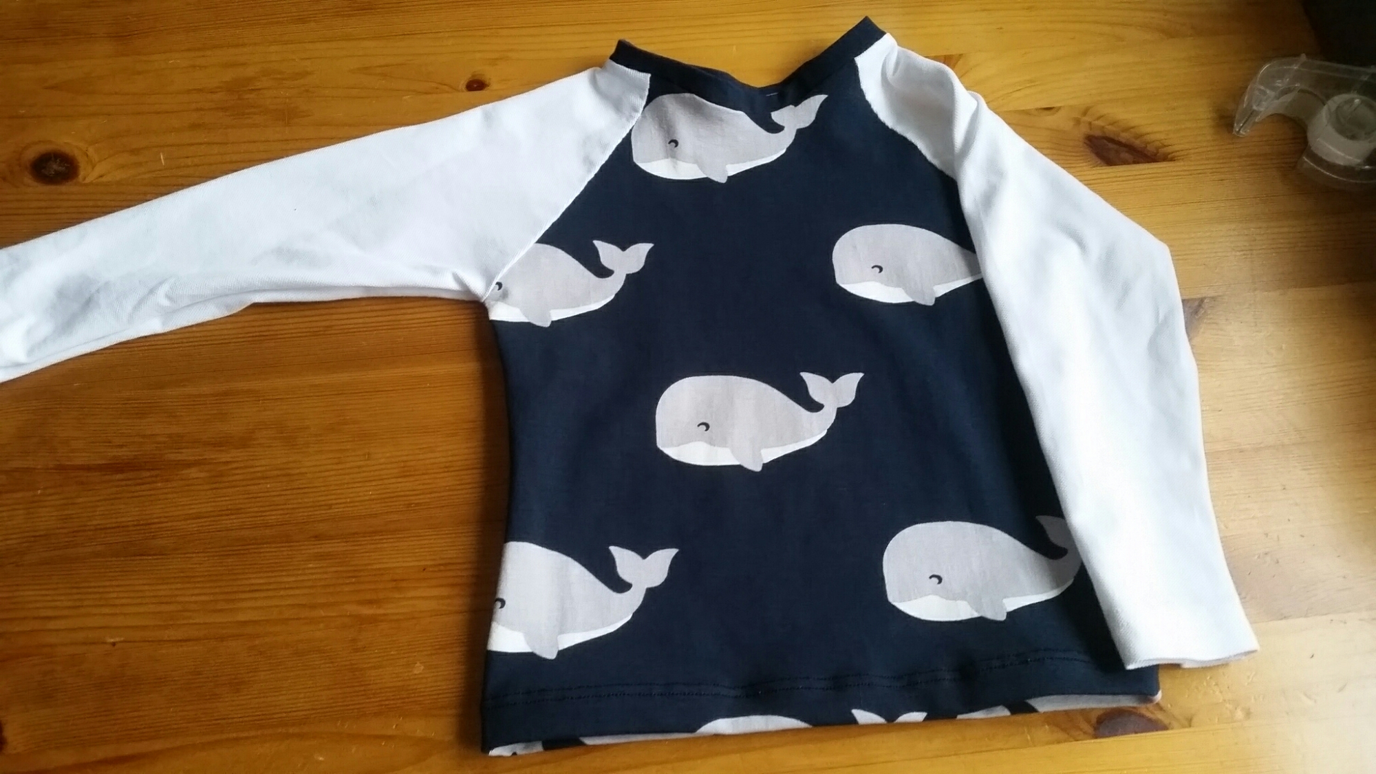 Eftersom jag inte ville ha valar över hela tröjan valde jag att klippa ut ärmar från en gammal T-shirt som hade kasserats på grund av att den var ful, men inte sliten. Fördelen med det var att jag slapp fixa snygga fållar vid ärmsluten. Jag använde helt enkelt nederkanten på T-shirten till det. Man får ju tänka på måtten då. Ingen sömsmån på den kanten.